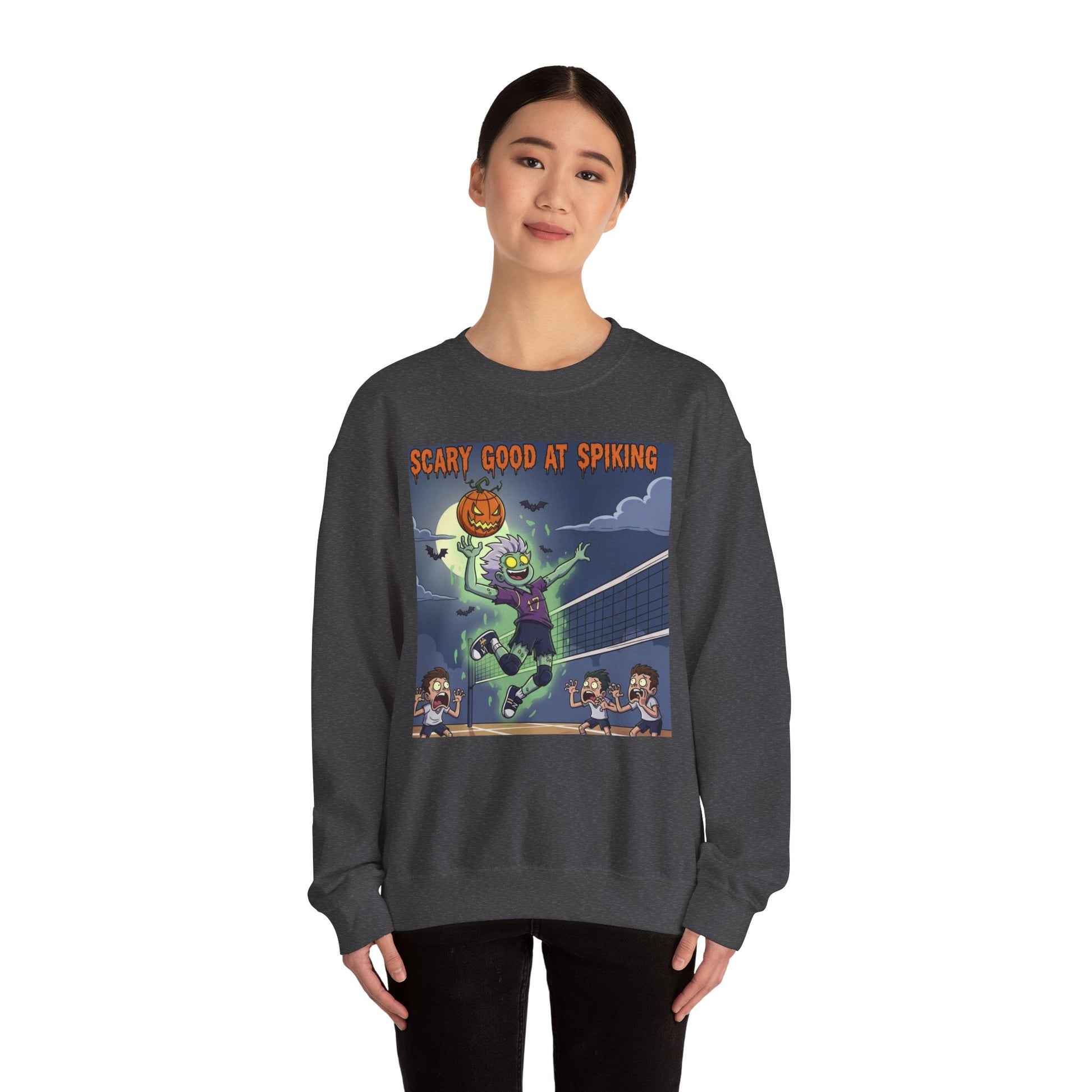 Embrace the spooky season with this unique and playful crewneck sweatshirt, perfect for Halloween enthusiasts. The vibrant design features a whimsical character that's 'Scary Good at Spiking,' making it an ideal choice for volleyball lovers celebrating Halloween. Crafted for comfort, this sweatshirt combines style and functionality, allowing you to showcase your personality while staying cozy. Perfect for casual outings, Halloween parties, or even just lounging at home, it is suitable for adults of all ages looking to add a touch of fun to their wardrobe. Wear it during spooky celebrations, festive gatherings, or as everyday attire to show off your spirit!